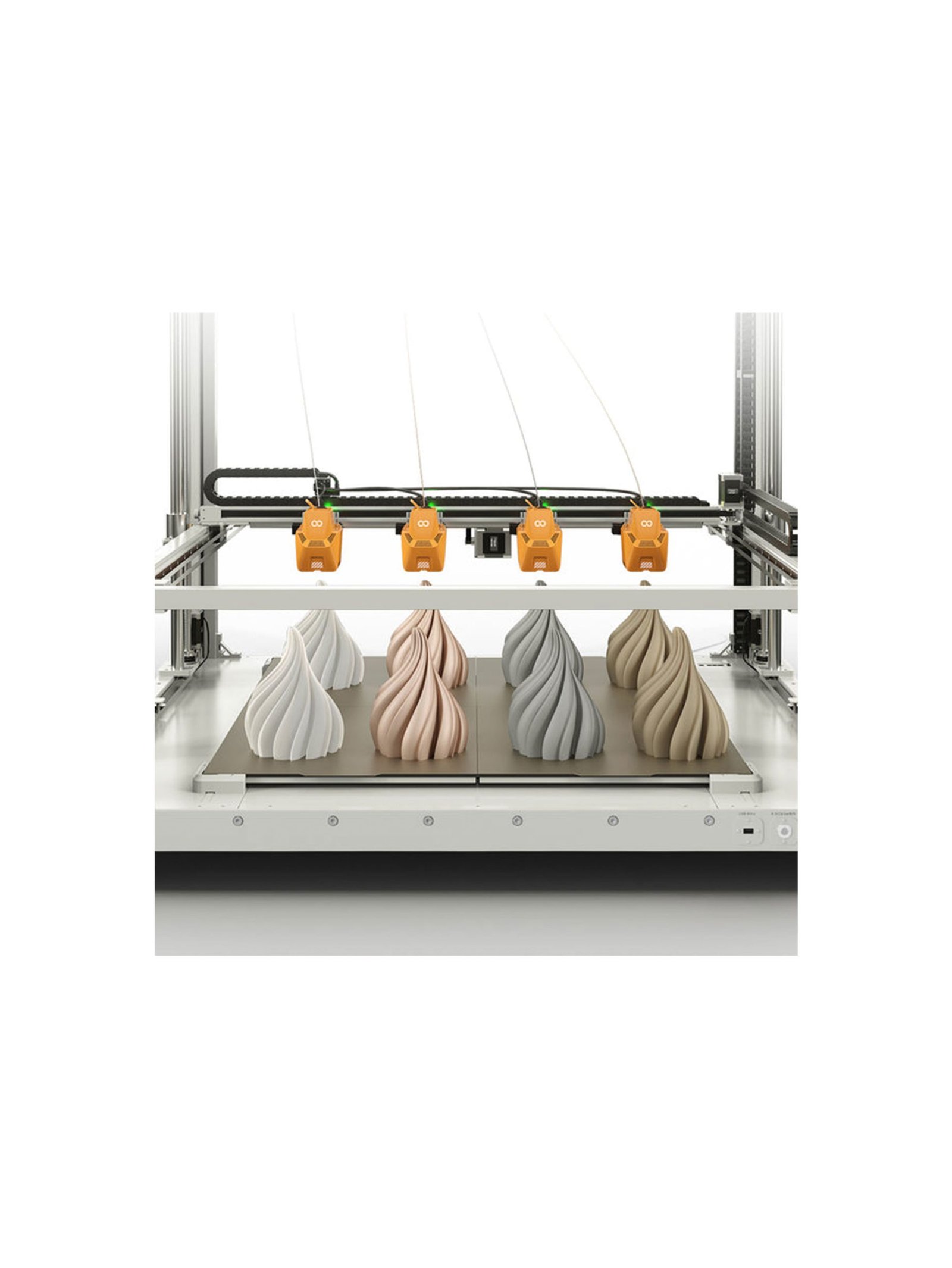 • Advanced Heated Bed System – Features four independent PEI magnetic platforms that heat efficiently, improving adhesion and reducing energy consumption.