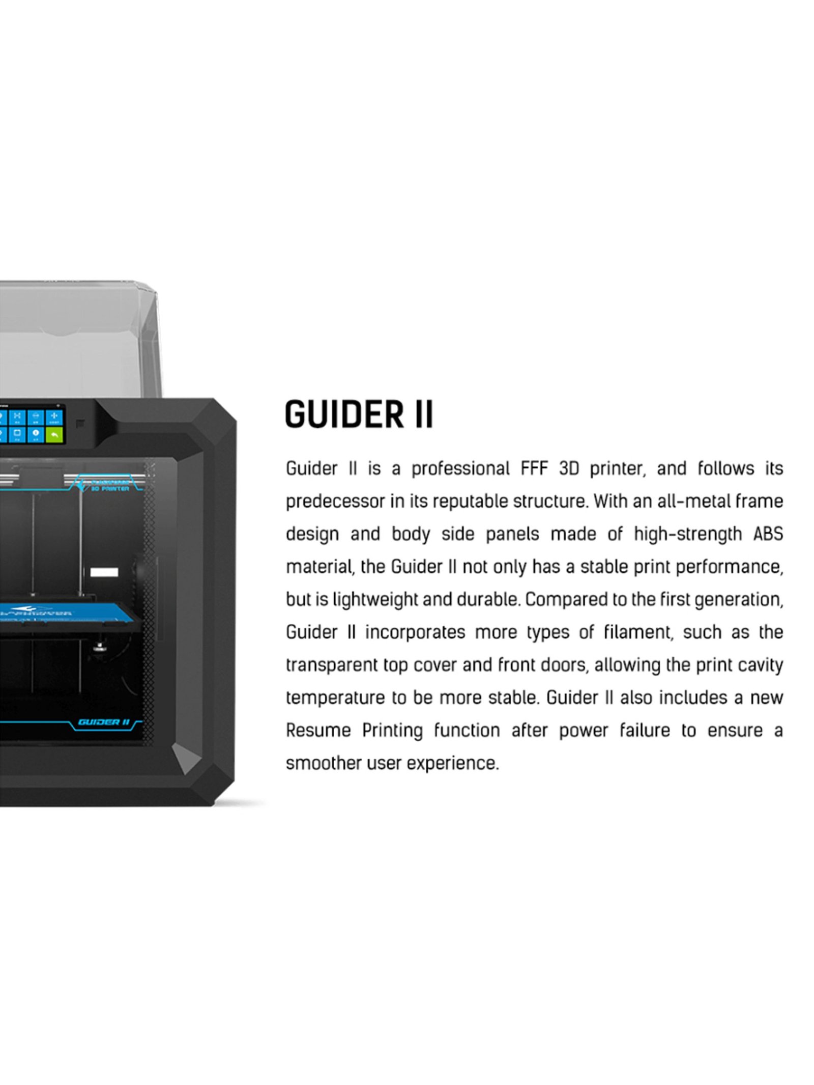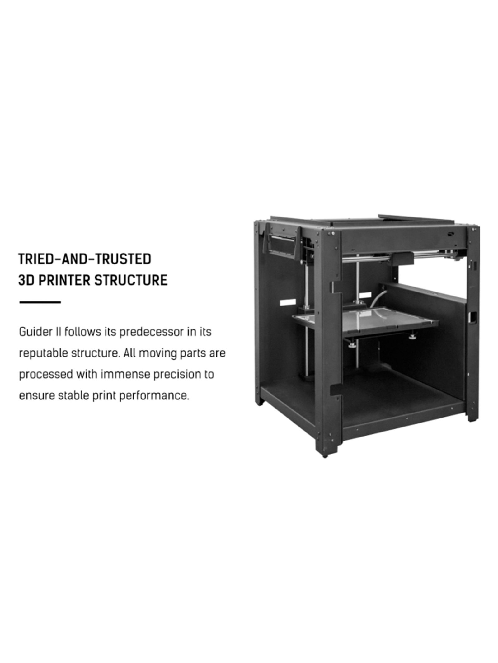 Large Industrial Build Volume – The Flashforge Guider II offers a spacious 280 × 250 × 300 mm build area, allowing users to print large prototypes or multiple smaller parts in one job, making it ideal for professional prototyping, education, and manufacturing.
